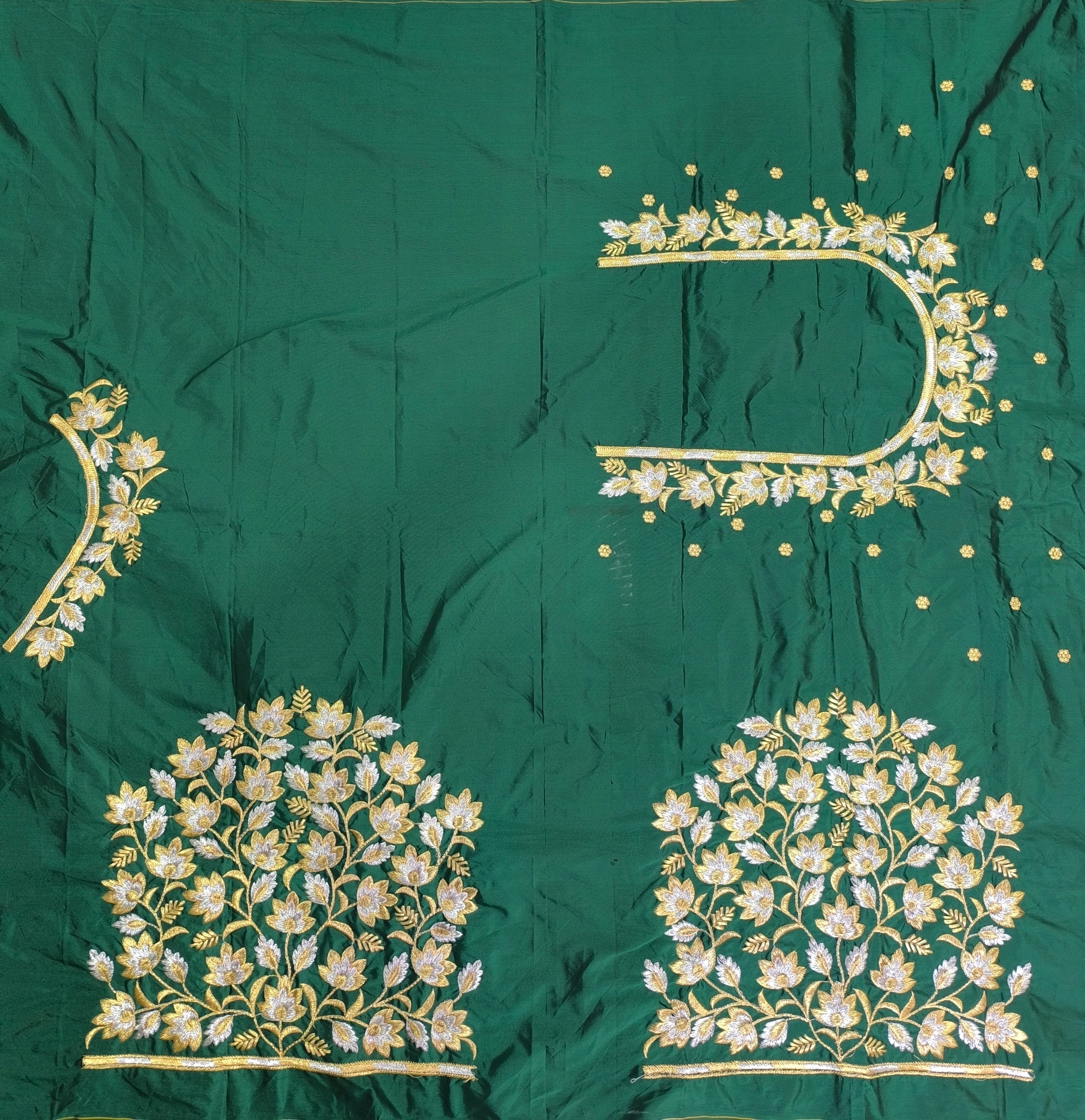 Elevate your ethnic wardrobe with this stunning Green Colour Computer Work Blouse, adorned with intricate floral patterns and elegant gold threadwork. Perfectly crafted, this blouse features: