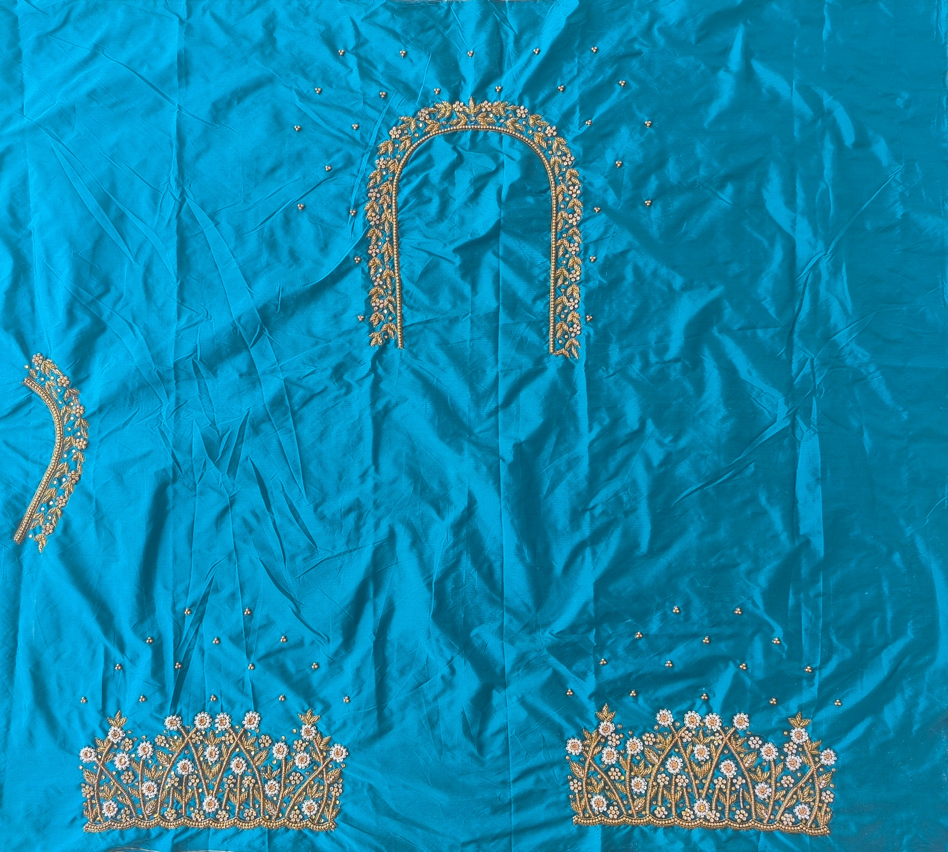Elevate your ethnic wardrobe with this stunning Ink Blue Colour Maggam Work Blouse, adorned with intricate floral patterns and elegant gold threadwork. Perfectly crafted, this blouse features: